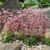 Saxifraga urbium 'Clarence Elliott (x)' (Schildersverdriet ) ook wel steenbreek genoemd, krijgt kleine roze/witte bloemen bezaaid met rode kwast.