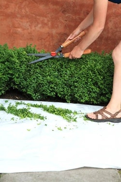 Foto: vang buxussnoeisel op door een laken of zeil naast de haag te leggen
