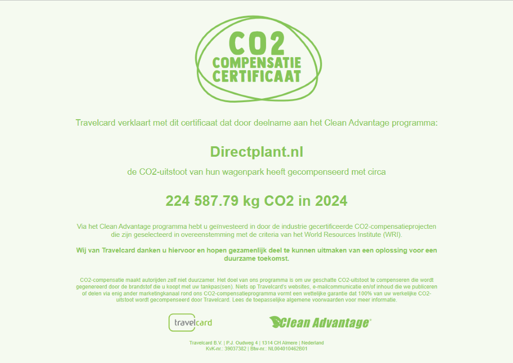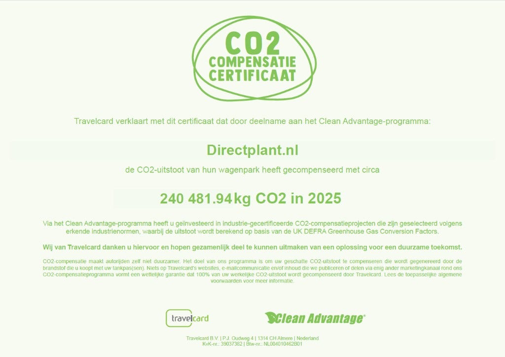 Bij Directplant hechten we waarde aan duurzaam ondernemen. Wij willen graag op een groene en verantwoorde manier werken. Wij gaan hierin verder dan het aanbieden van mooie planten en bomen om tuinen in Nederland en België te vergroenen. Ook de bezorging doen wij CO2 neutraal!